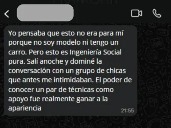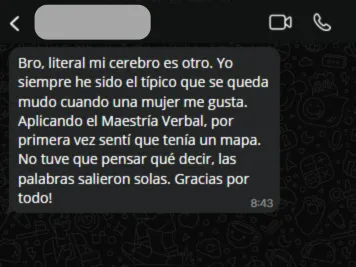 Potencializa tu jornada en la Verbal Game Academy con acceso a nuestra comunidad. Este espacio no es para quejarse, es para ganar. Conecta con otros hombres que están mejorando sus habilidades, comparte tus reportes de campo y recibe feedback honesto. Rodéate de ganadores y tu éxito será inevitable.